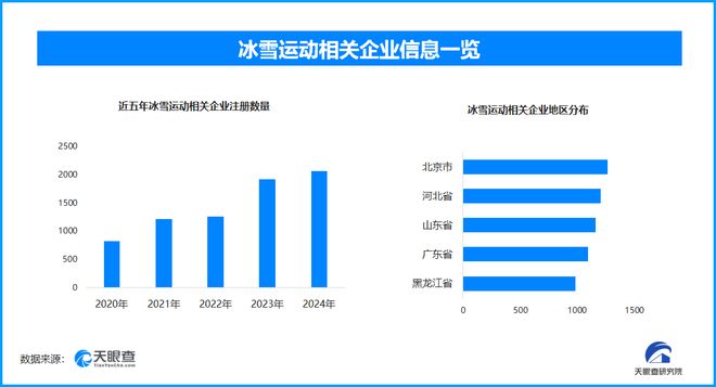 小雪季节一过,冰雪冬季运动就到了“黄金时刻”。在北京,北京延庆国家高山滑雪中心开业,同时,2025-2026北京冰雪消费季拉开帷幕,冰雪场馆导览活动开始。延庆区也开启欢乐冰雪季,推出“民宿长租”、“滑雪+自动驾驶”等便民举措礼包。各大滑雪场陆续开业。吉林的通化滑雪场也开放迎接客人。万峰统化滑雪场扩建了滑雪场,增加了雪道,并升级了智能捕捉技术,自动“生成视频”。随着沉白高铁的开通,出行效率提升,通化市开辟专属接驳线路,建立优质旅游线路,促进旅游出行。黑龙江省第27届哈尔滨冰雪节冰雪大世界正在建设中。公园将全面扩建,增加新的设施和娱乐项目,打造“冰雪+体育”新舞台,举办赛事。预计12月中下旬开业,将为游客提供全新的冰雪体验。天眼查专业版数据显示,目前我国运营和存有的冰雪运动相关企业超过14000家。其中,2025年新注册相关企业约2100家。如果从注册企业数量趋势分析,近五年冰雪运动相关注册企业数量逐年增加,预计2024年达到峰值。从区域分布来看,北京、河北省和山东省冰雪运动相关企业数量最多,超过2024家。月 1,200 家公司分别有超过 1,200 家公司和超过 1,100 家公司。排名第二的广东是唯一进入前十的南方省份,相关企业超过1000家。